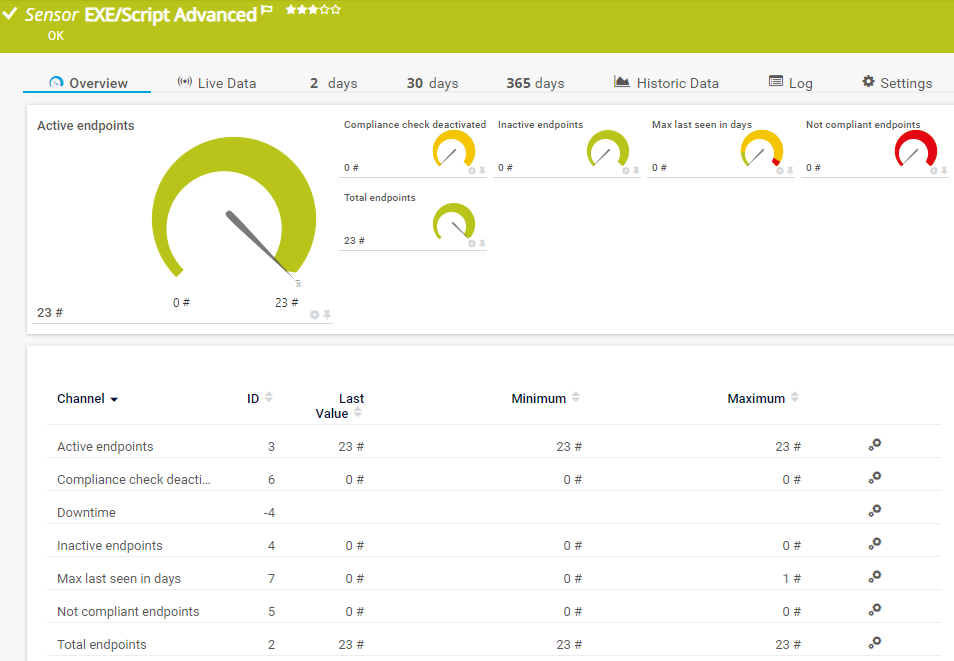 In the channel table on the Overview tab, this channel never shows any values. PRTG uses this channel in graphs and reports to show the amount of time in which the sensor was in the Down status.