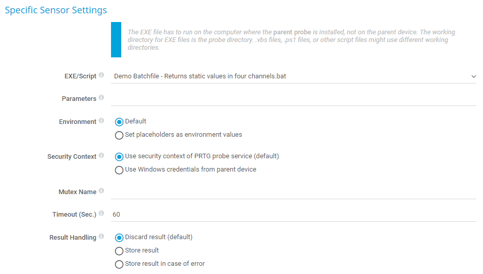 Use security context of PRTG probe service: Run the file under the same Windows user account that the probe system runs under. By default, this is the Windows system user account.