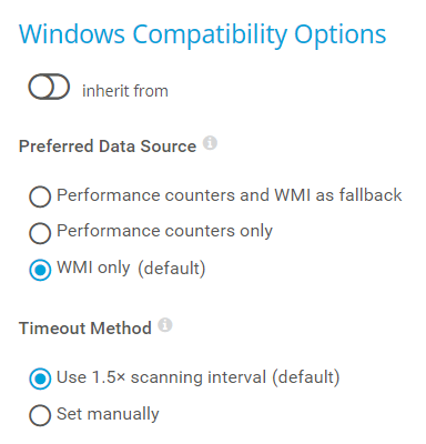 Compatibility mode (deprecated): Use this only if the default connection mode does not work on the target system. The compatibility mode is the connection mode that PRTG used in previous versions and it is deprecated.